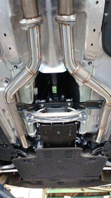 I had my exhaust guy slap together some piping I picked out from Summit Racing and do a 2-cat delete (as we all know, there are 4 cats: two bolted to the turbos, and two bolted at the ends of the downpipe). What you're about to see looks jenky because the polished 304 stainless bends were on sale and cheaper than the non-polished 409 stainless bends. But because I was clearly trying to be cheap, the non-polished 409 straights were cheaper then the polished 409 straights. Trust me, I'm not proud of it, but for $450 total (parts + labor), the top-end gains were worth it: